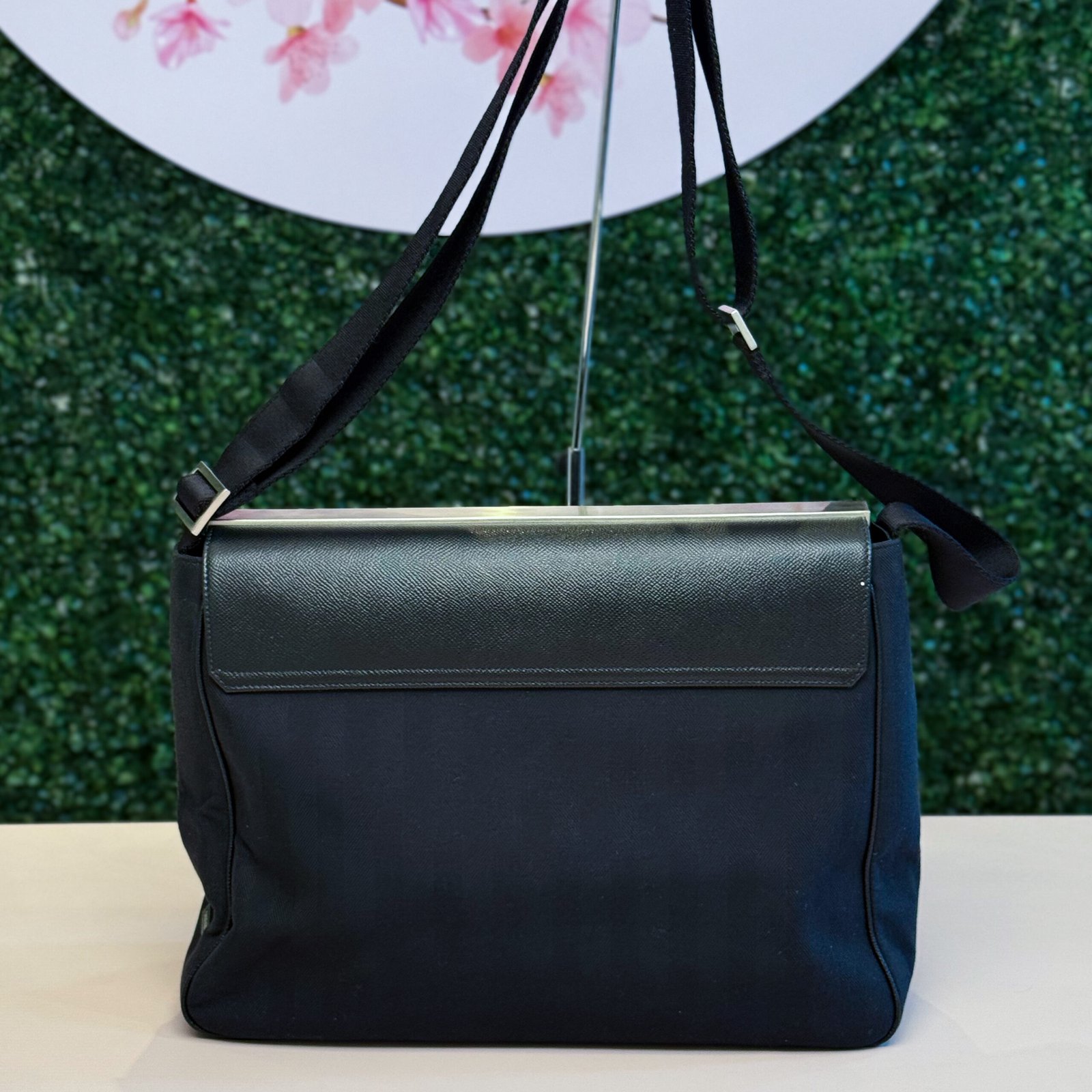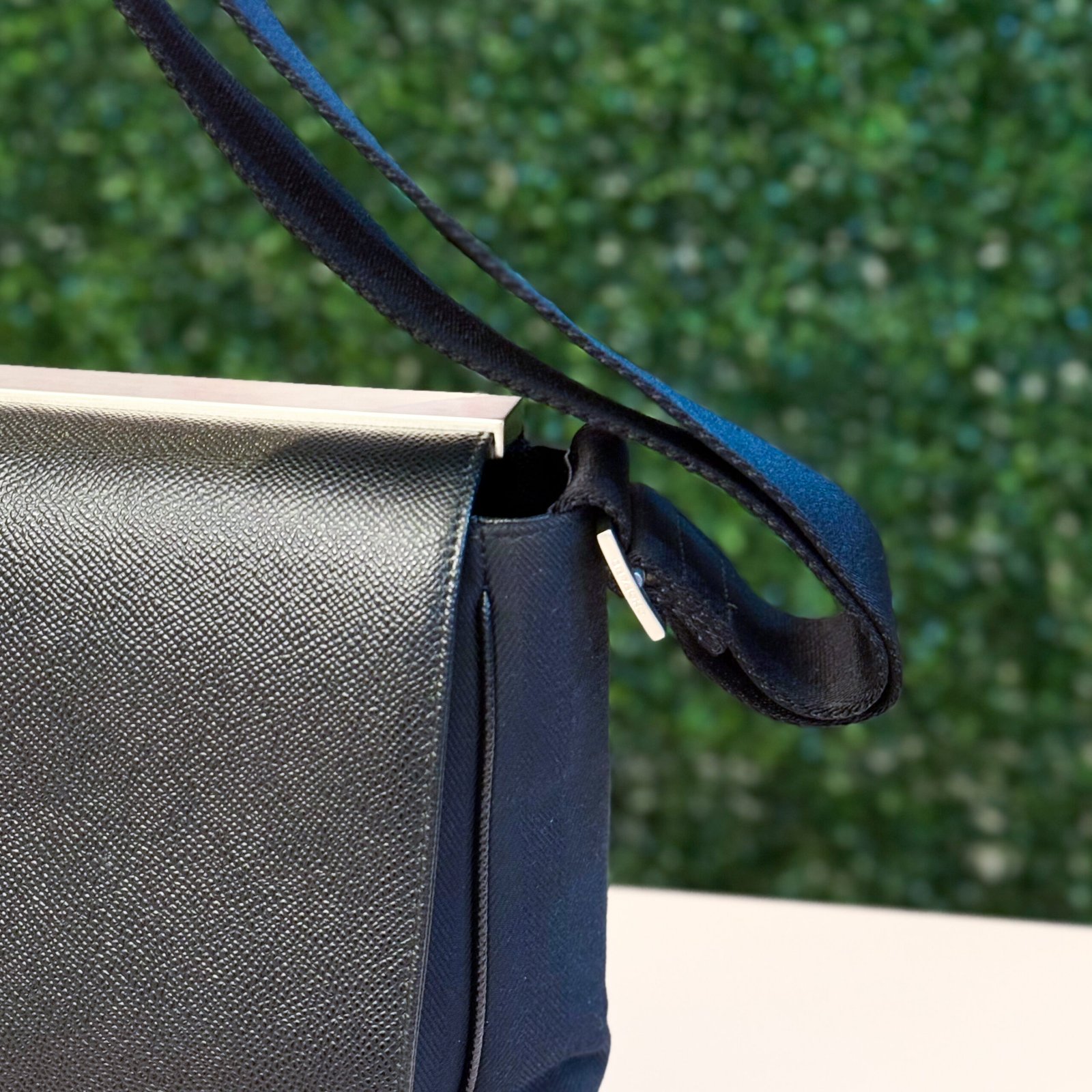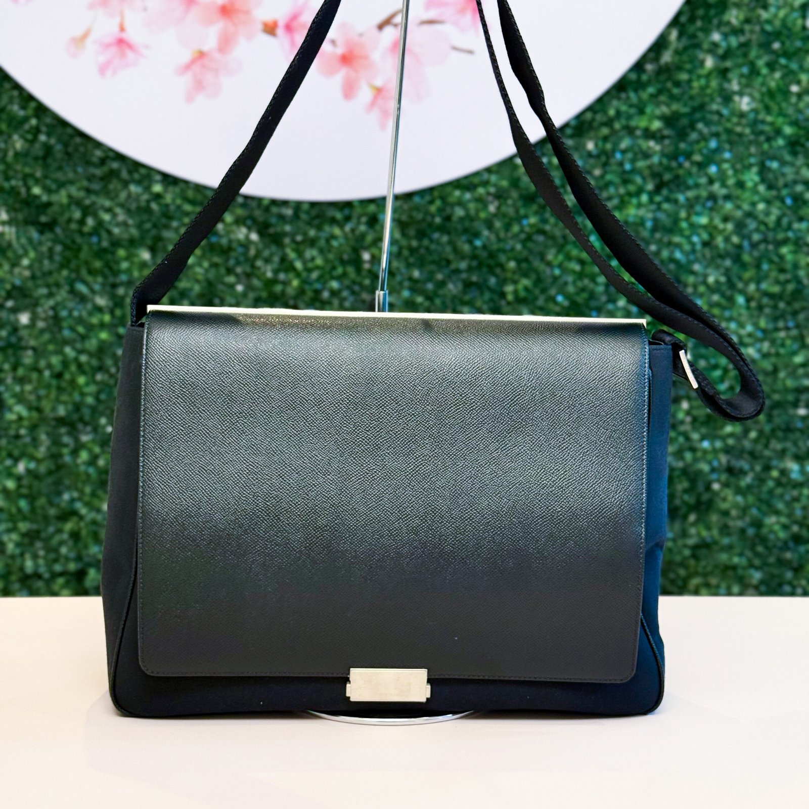 Em couro preto é a definição da elegância moderna e funcional. O modelo de aba estruturada, com corpo em material têxtil e hardware prateado no fecho, é versátil e perfeito para o dia a dia de trabalho ou para a noite. A bolsa se encontra em excelente estado de conservação (Seminova).