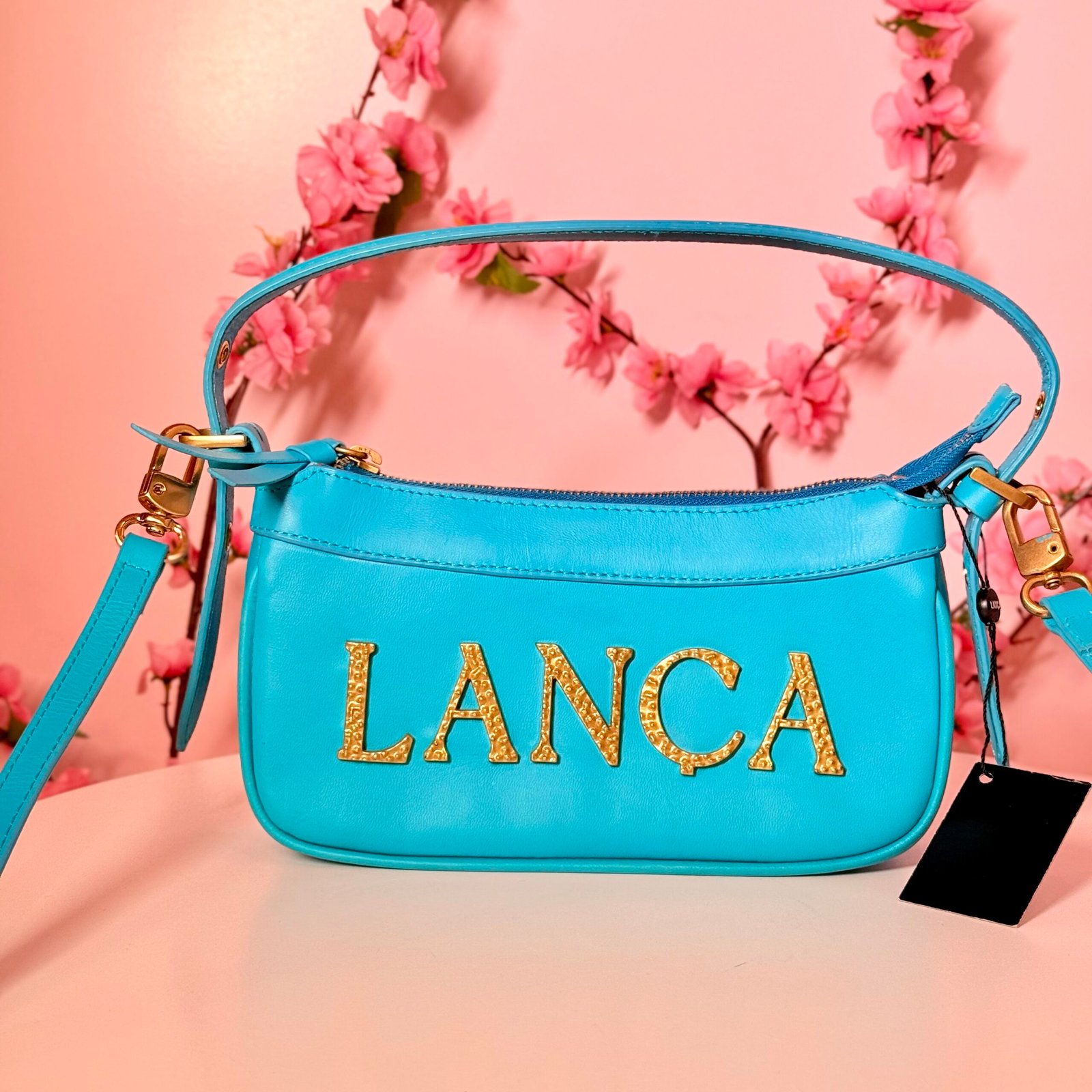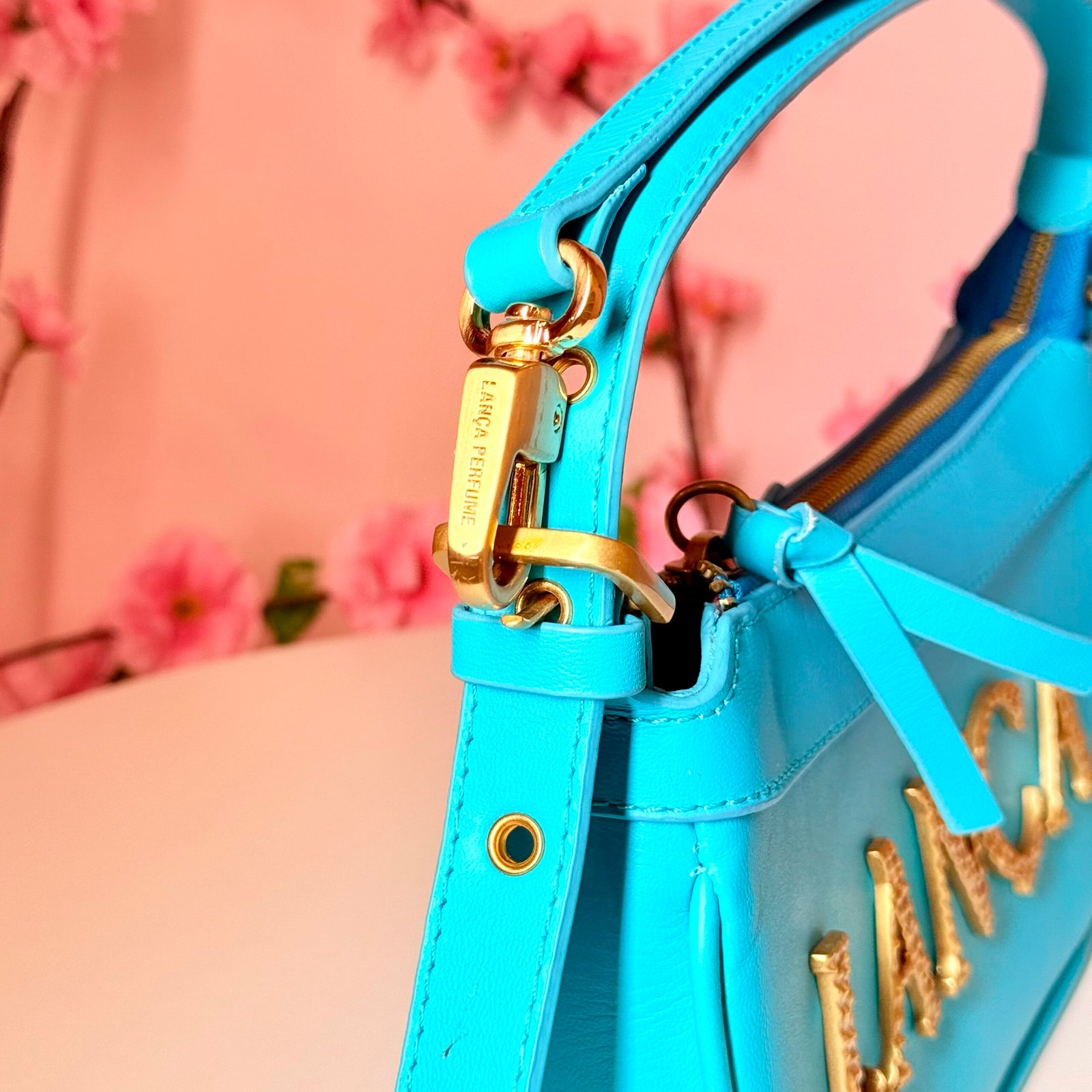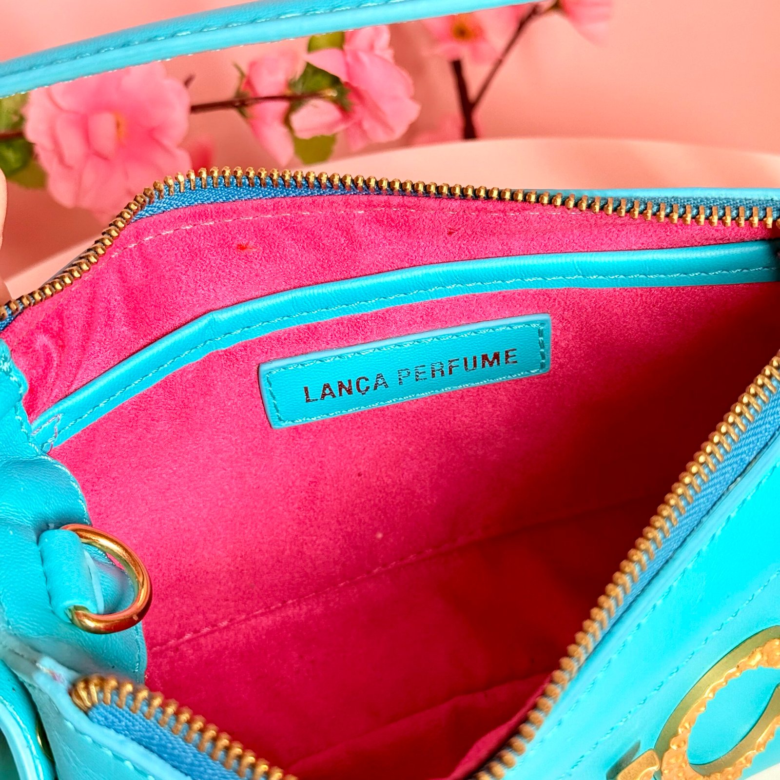 Esta Bolsa de ombro Transversal da marca Lança Perfume é um item de acessório de design moderno, ideal para quem busca uma peça divertida e trendy. O modelo apresenta um formato retangular, com alça regulável, e um acabamento em material liso na cor Azul Turquesa, destacando as letras LANÇA em metal dourado e texturizado na parte frontal. É um item essencial para um visual ousado e cool, combinando o design prático e compacto com a cor vibrante e o brilho das letras em relevo