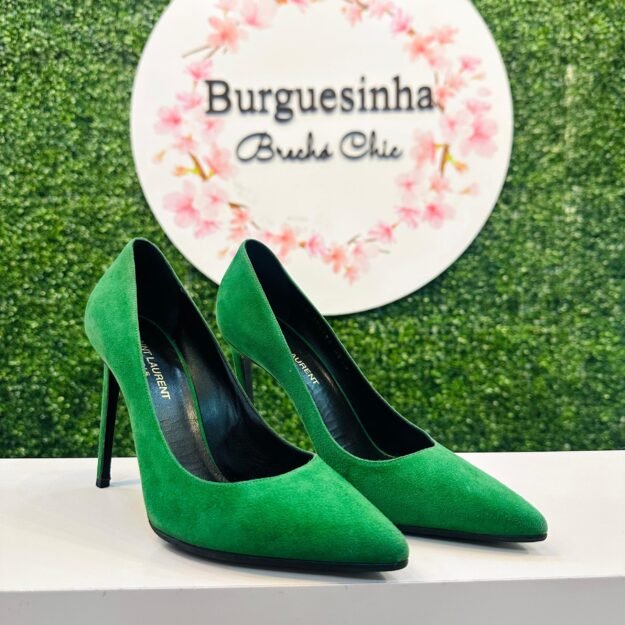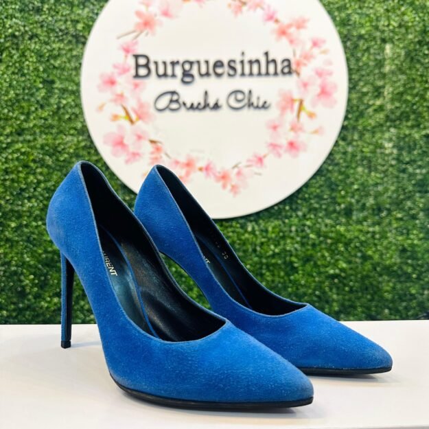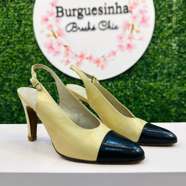 O modelo é o clássico com o emblema Vara, caracterizado pelo icônico laço de gorgurão preto com detalhe metálico dourado, que adiciona um toque de distinção e tradição da marca. O salto alto e fino (Stiletto) garante uma silhueta alongada e imponente, tornando-o perfeito para eventos formais, reuniões de trabalho e ocasiões noturnas.
