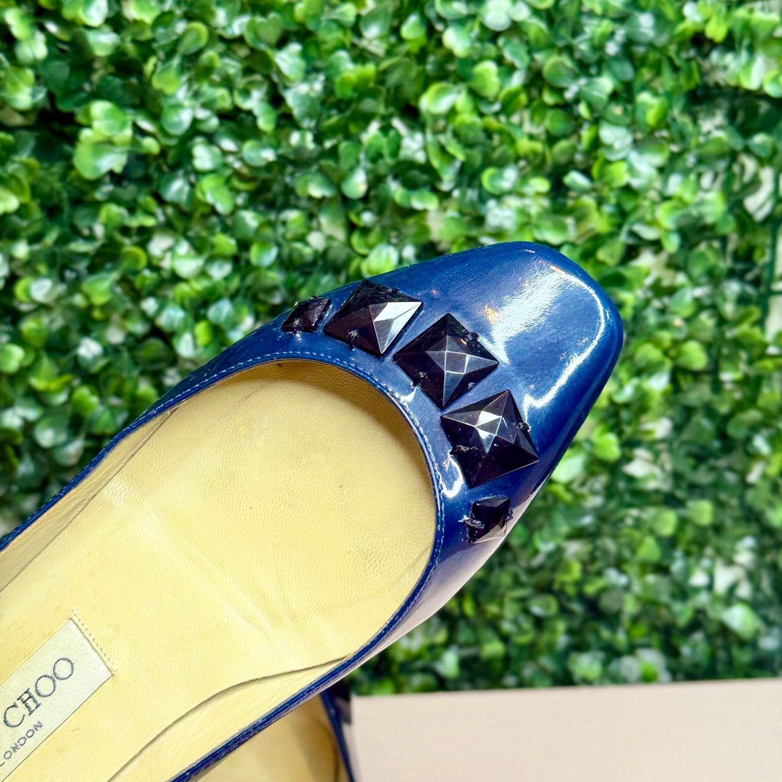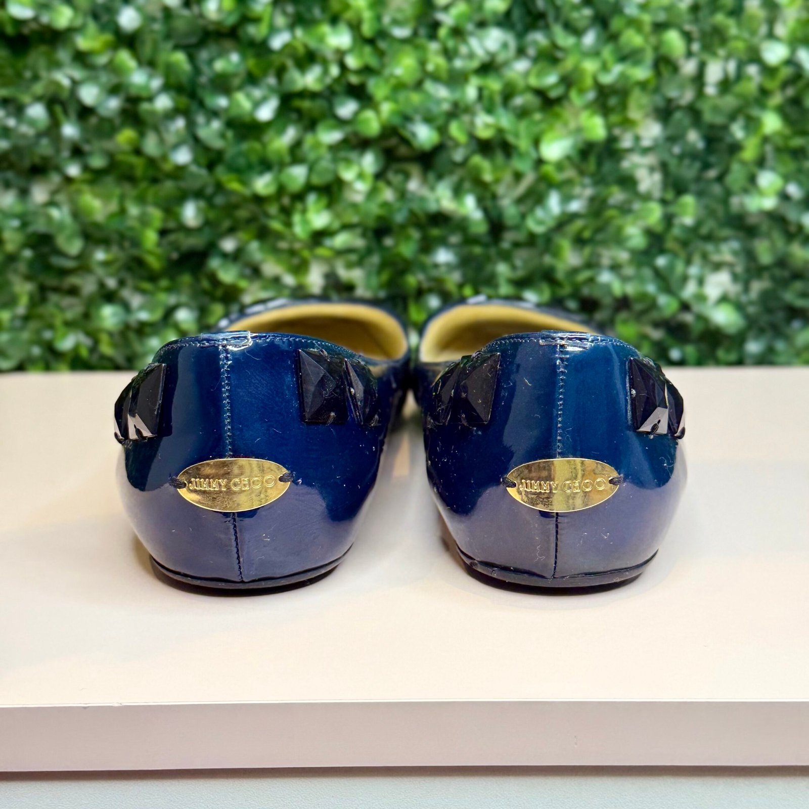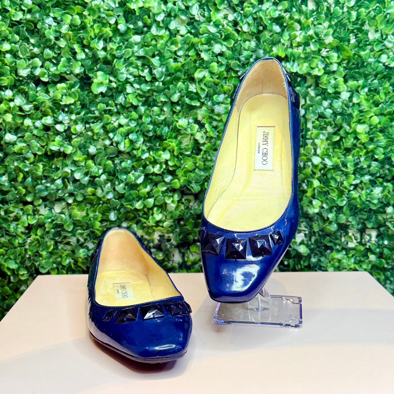 A Sapatilha Jimmy Choo é uma peça de luxo que equilibra conforto e atitude. Confeccionada em couro envernizado de alto brilho, ela possui um marcante tom de Azul. O design clássico de sapatilha é modernizado com a aplicação de tachas pretas em formato de pirâmide na ponta, que injetam um toque rock-chic na peça. Este calçado é perfeito para adicionar sofisticação e estilo sem abrir mão do conforto, sendo ideal para transitar do ambiente de trabalho a eventos casuais.