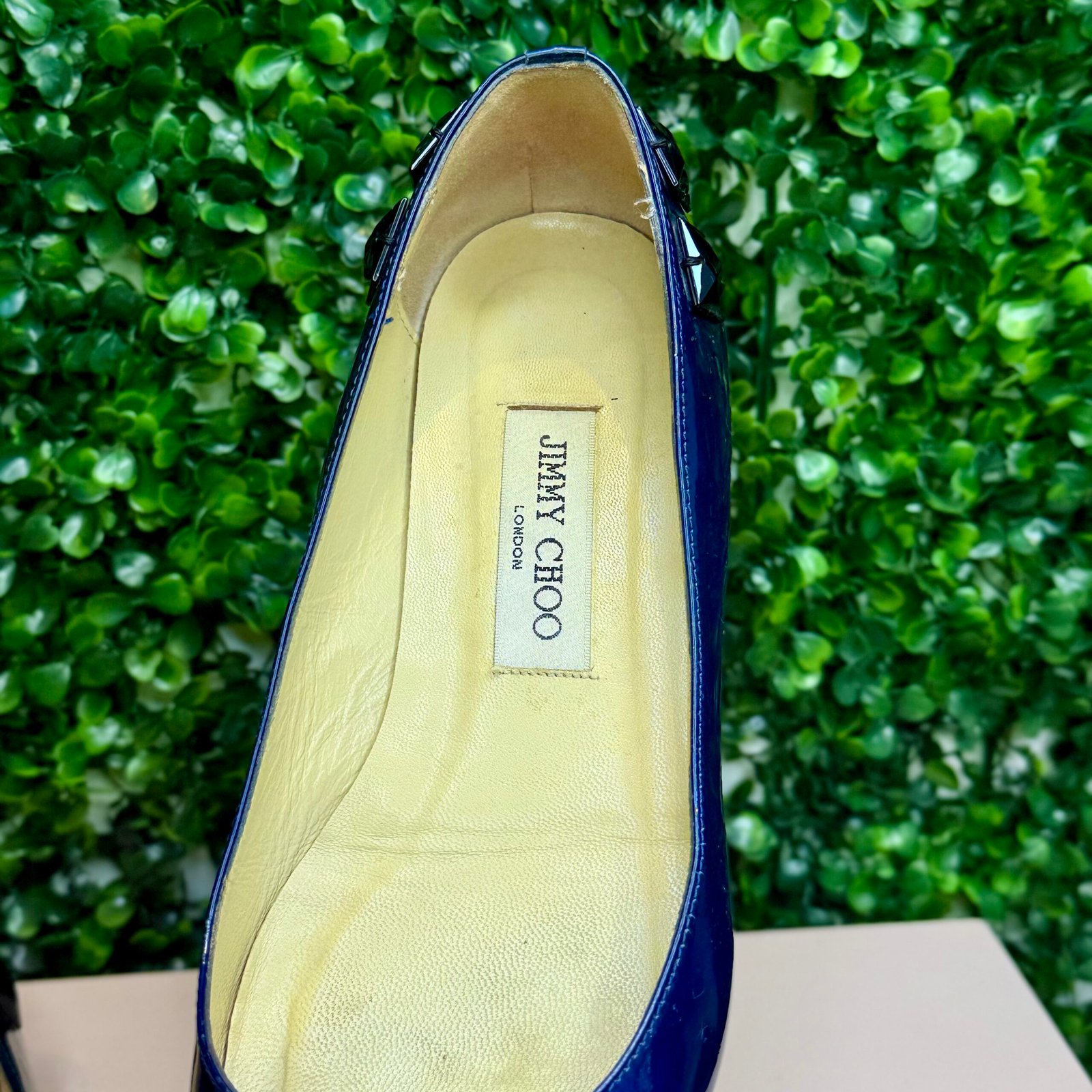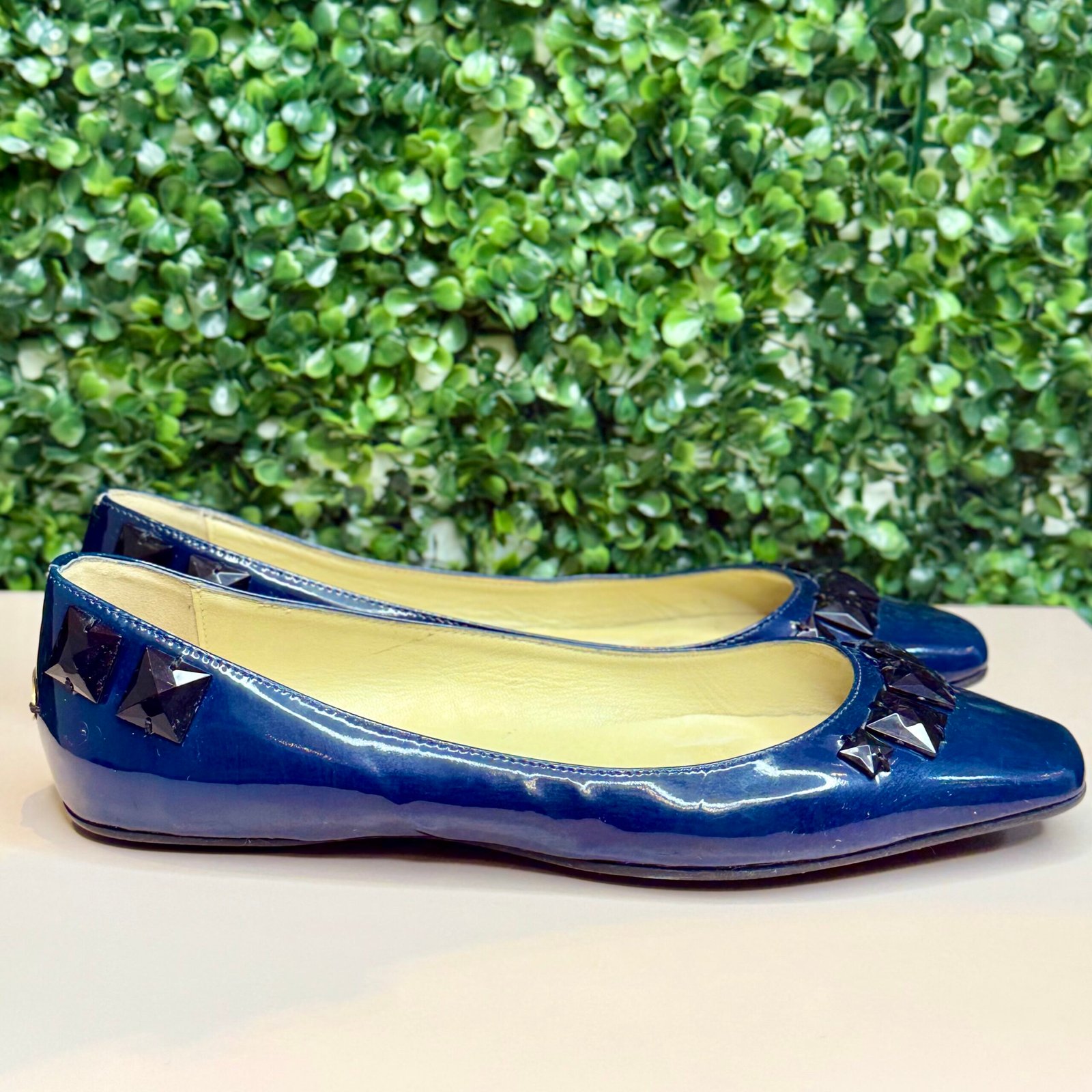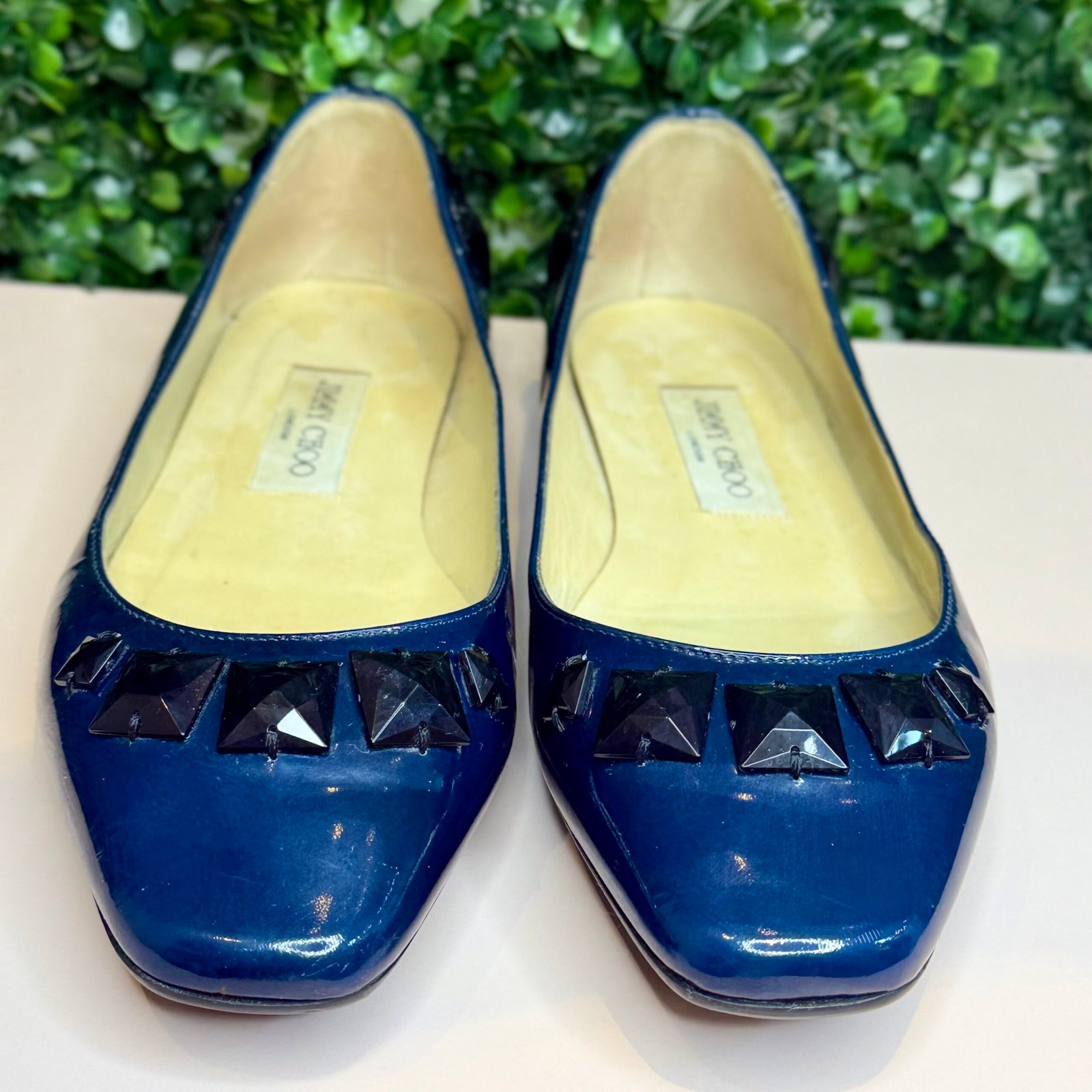 A Sapatilha Jimmy Choo é uma peça de luxo que equilibra conforto e atitude. Confeccionada em couro envernizado de alto brilho, ela possui um marcante tom de Azul. O design clássico de sapatilha é modernizado com a aplicação de tachas pretas em formato de pirâmide na ponta, que injetam um toque rock-chic na peça. Este calçado é perfeito para adicionar sofisticação e estilo sem abrir mão do conforto, sendo ideal para transitar do ambiente de trabalho a eventos casuais.
