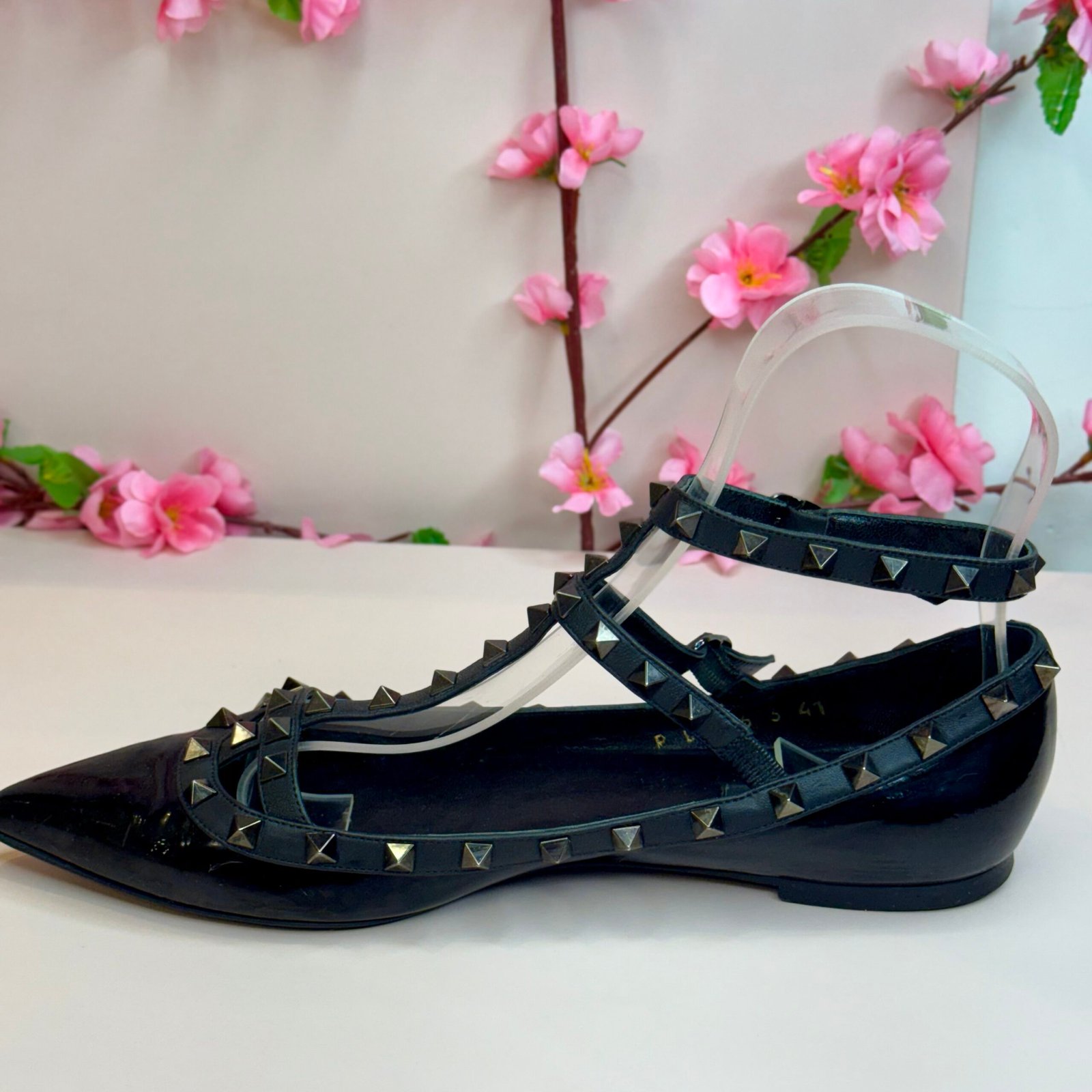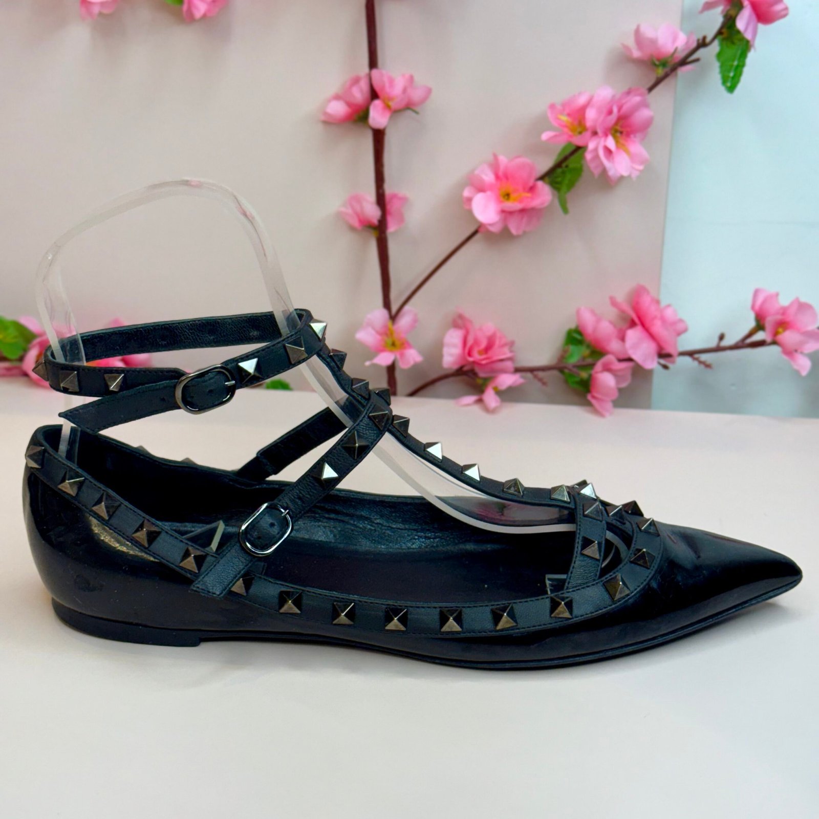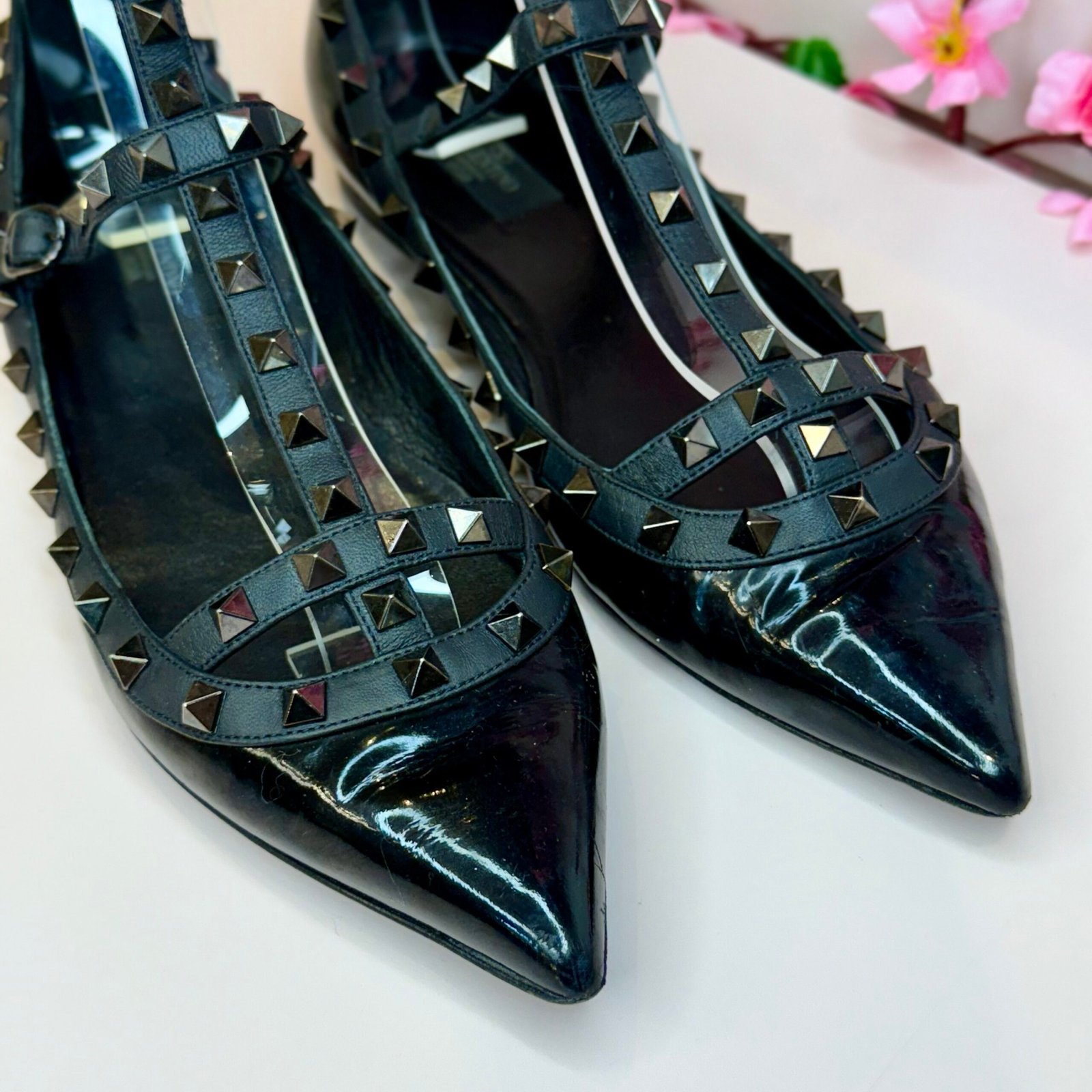 Esta é a autêntica sapatilha Valentino Garavani Rockstud na cor Noir, um ícone de luxo que equilibra elegância e atitude punk-rock. Confeccionada em couro envernizado preto de altíssima qualidade, a peça possui um sofisticado bico fino e é adornada pelas inconfundíveis tachas piramidais em tom chumbo, aplicadas artesanalmente nas tiras que cruzam o peito do pé e contornam o cabedal. O design de múltiplas tiras garante um ajuste seguro e um visual poderoso, sendo um item de desejo que confere status imediato a qualquer produção. O tamanho marcado no solado é 41 EUR, que corresponde ao 39 BR. A sapatilha se encontra em excelente estado de conservação (semi-novo).
