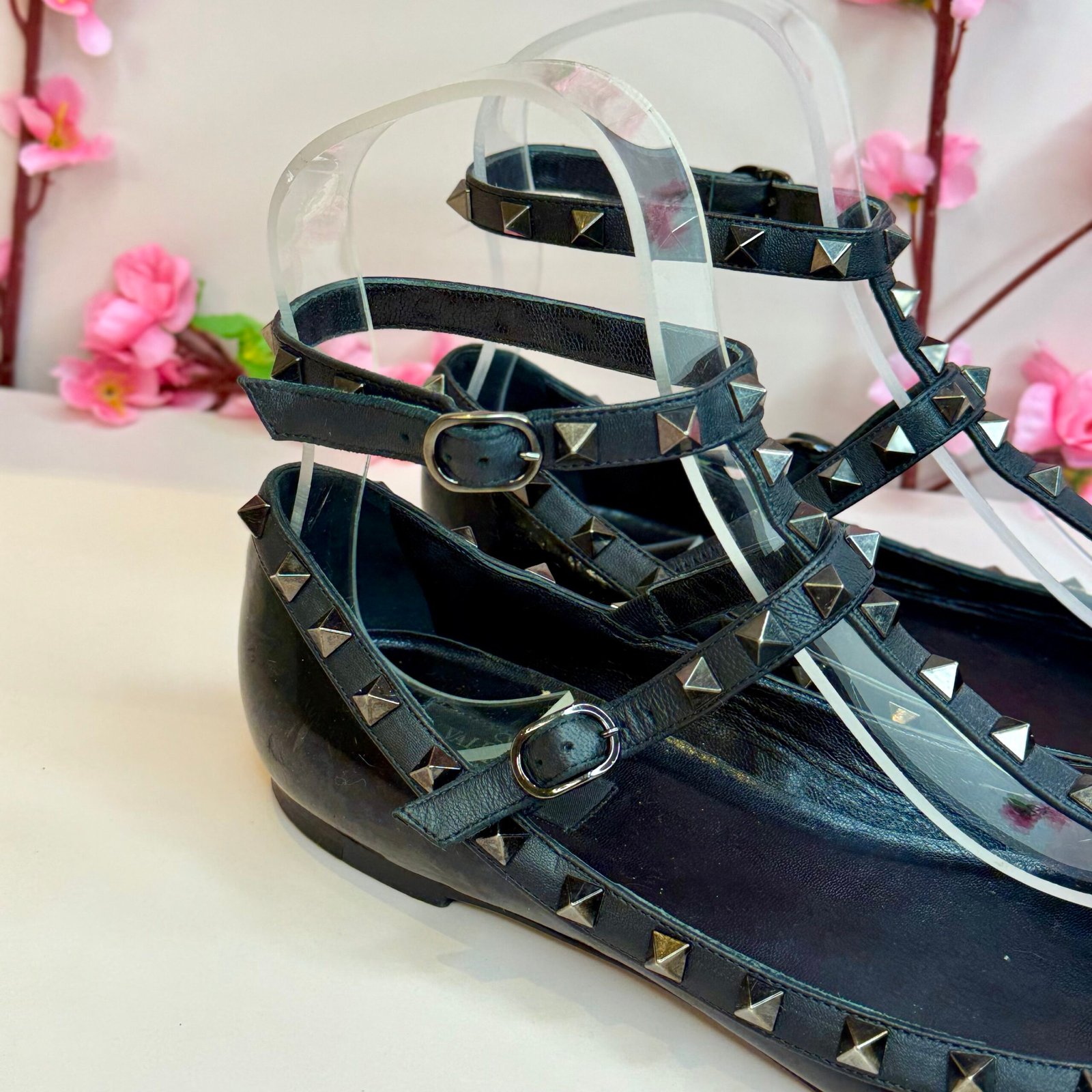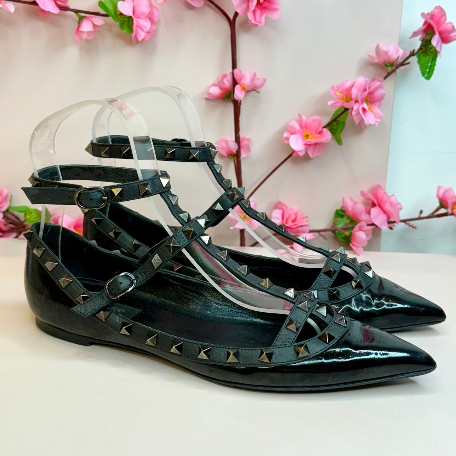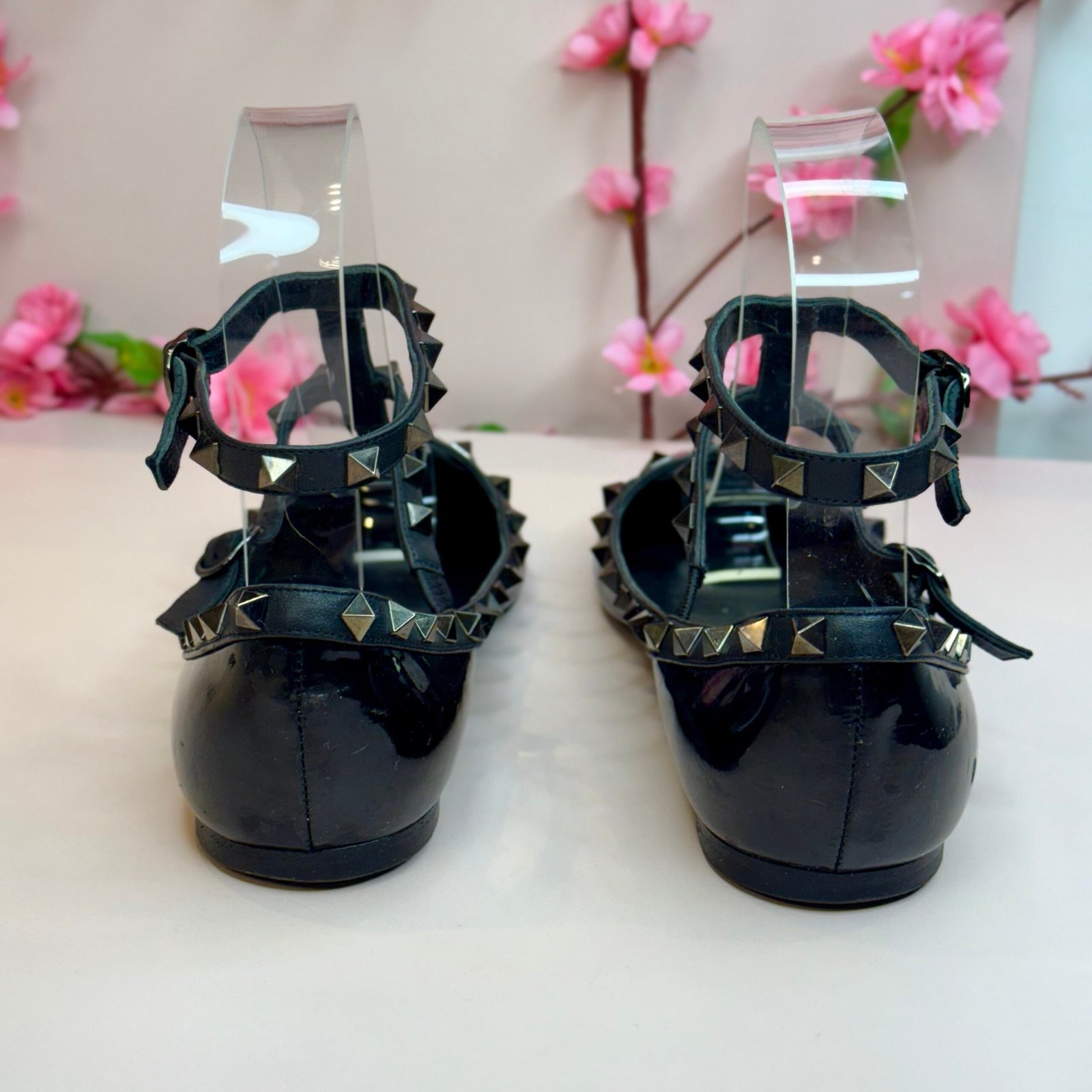 Esta é a autêntica sapatilha Valentino Garavani Rockstud na cor Noir, um ícone de luxo que equilibra elegância e atitude punk-rock. Confeccionada em couro envernizado preto de altíssima qualidade, a peça possui um sofisticado bico fino e é adornada pelas inconfundíveis tachas piramidais em tom chumbo, aplicadas artesanalmente nas tiras que cruzam o peito do pé e contornam o cabedal. O design de múltiplas tiras garante um ajuste seguro e um visual poderoso, sendo um item de desejo que confere status imediato a qualquer produção. O tamanho marcado no solado é 41 EUR, que corresponde ao 39 BR. A sapatilha se encontra em excelente estado de conservação (semi-novo).