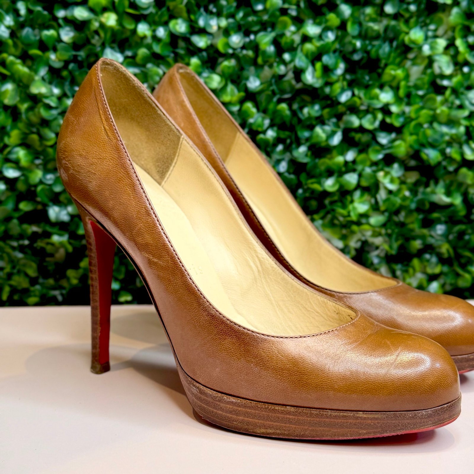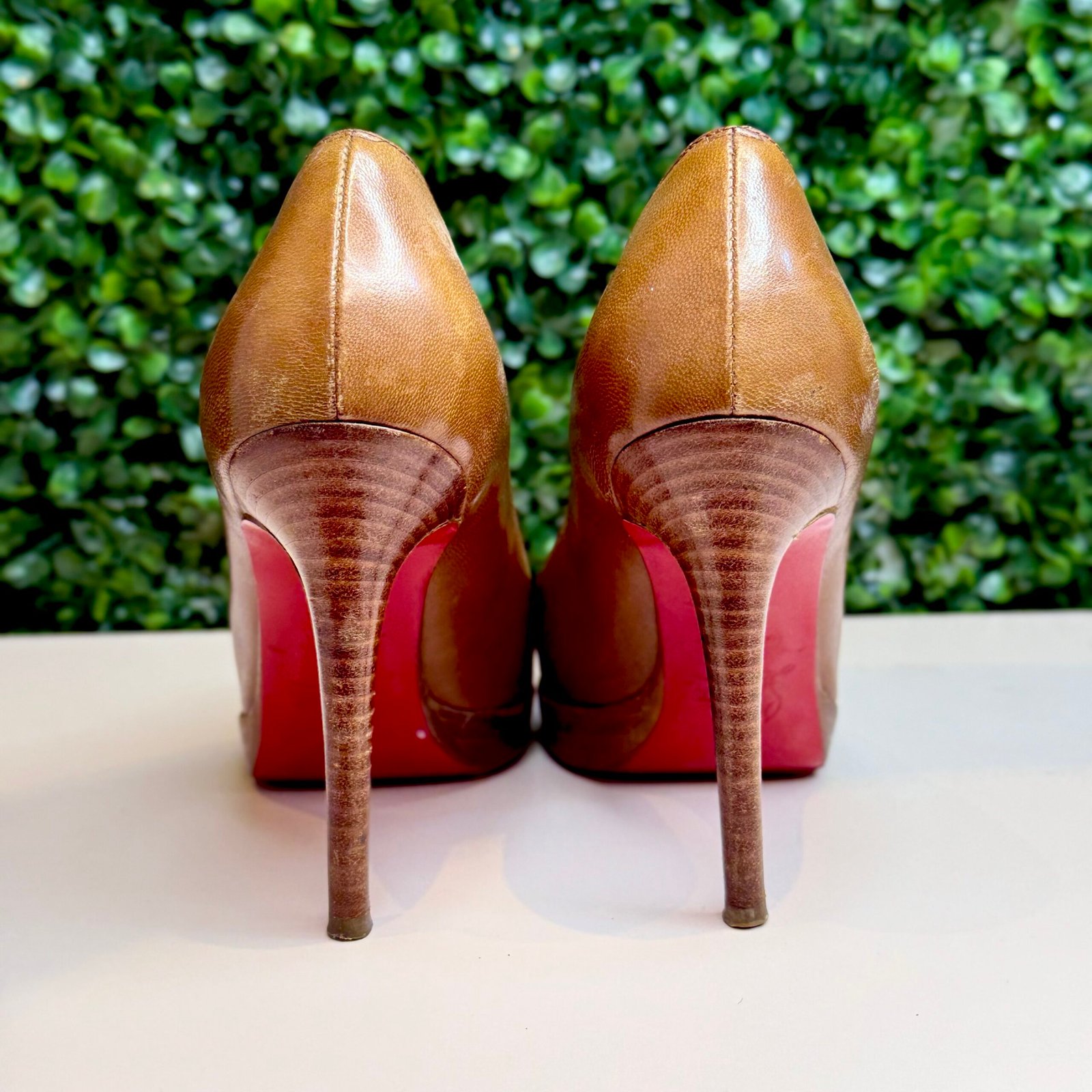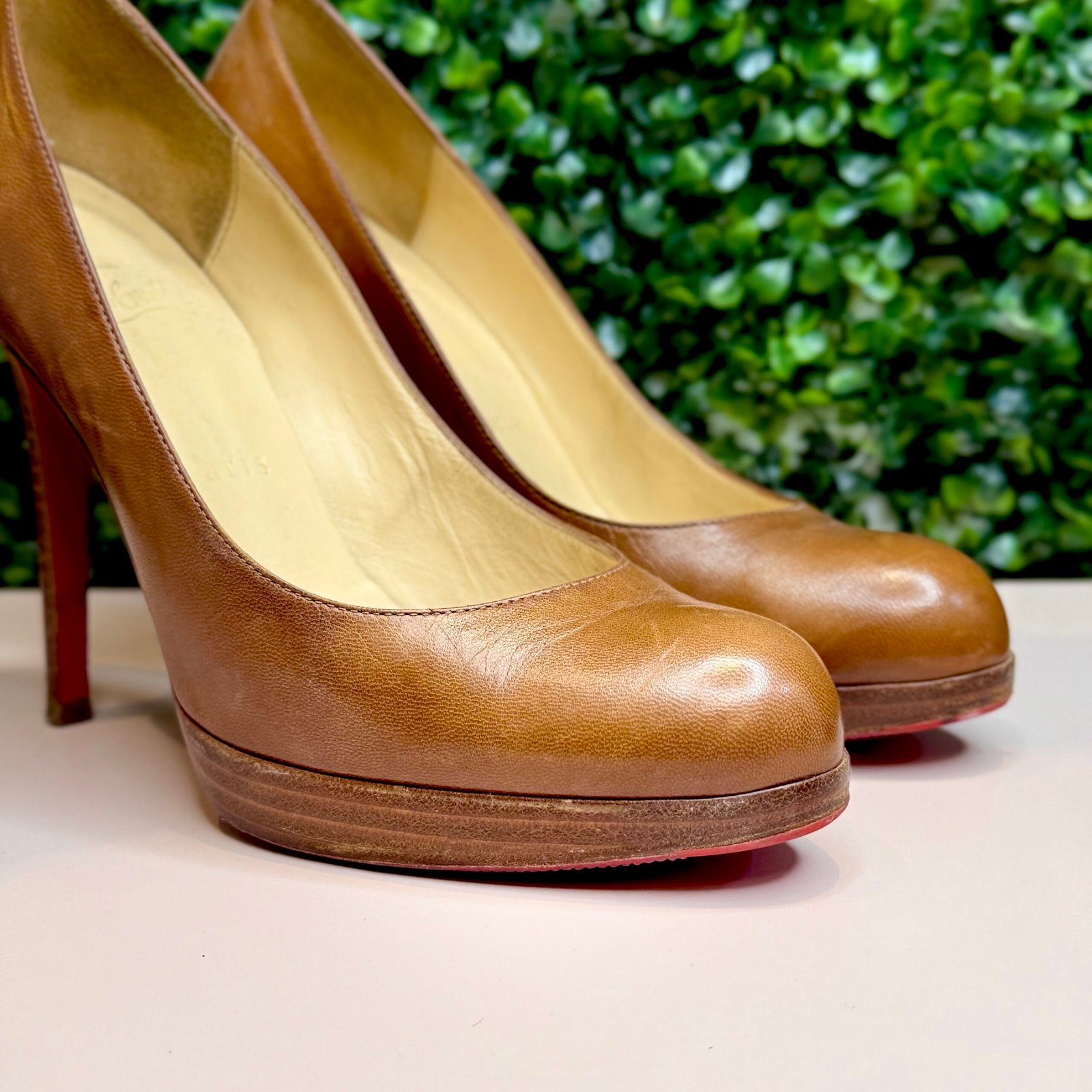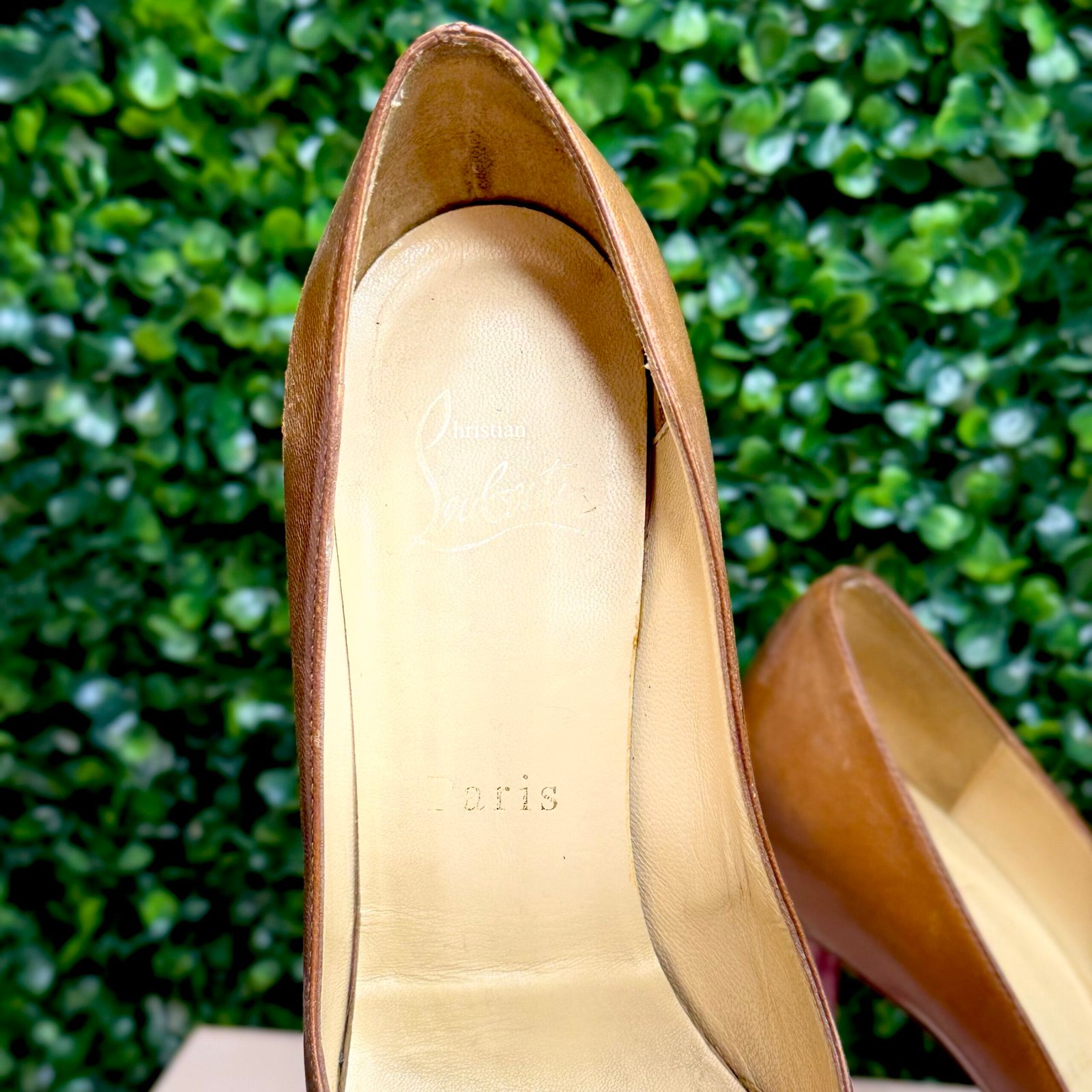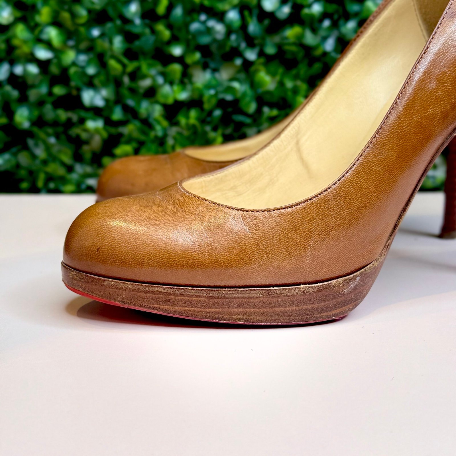 O Scarpin Christian Louboutin traz a essência da marca com o seu design clássico e atemporal de bico arredondado e salto alto, confeccionado em elegante couro liso na cor Caramelo. Este modelo é perfeito para adicionar um toque de sofisticação versátil e o glamour icônico do solado vermelho ao seu visual de trabalho ou eventos casuais chiques.