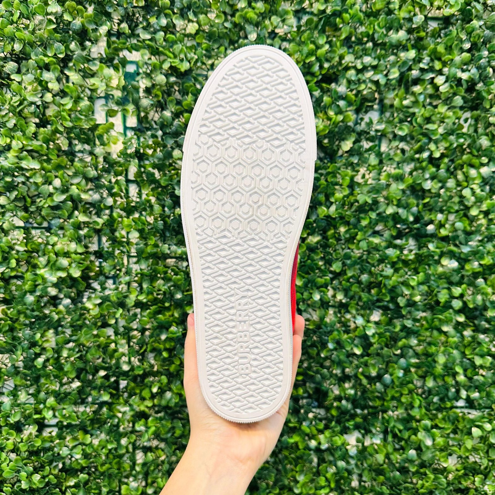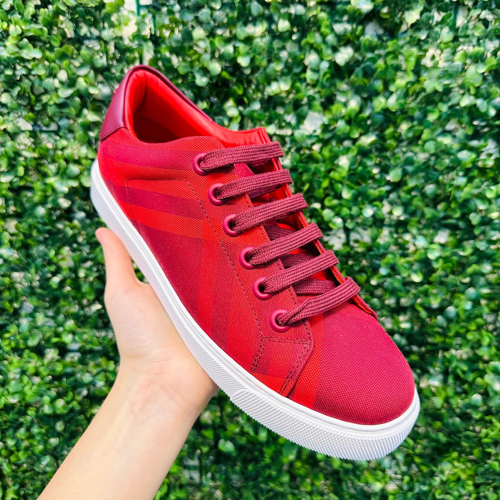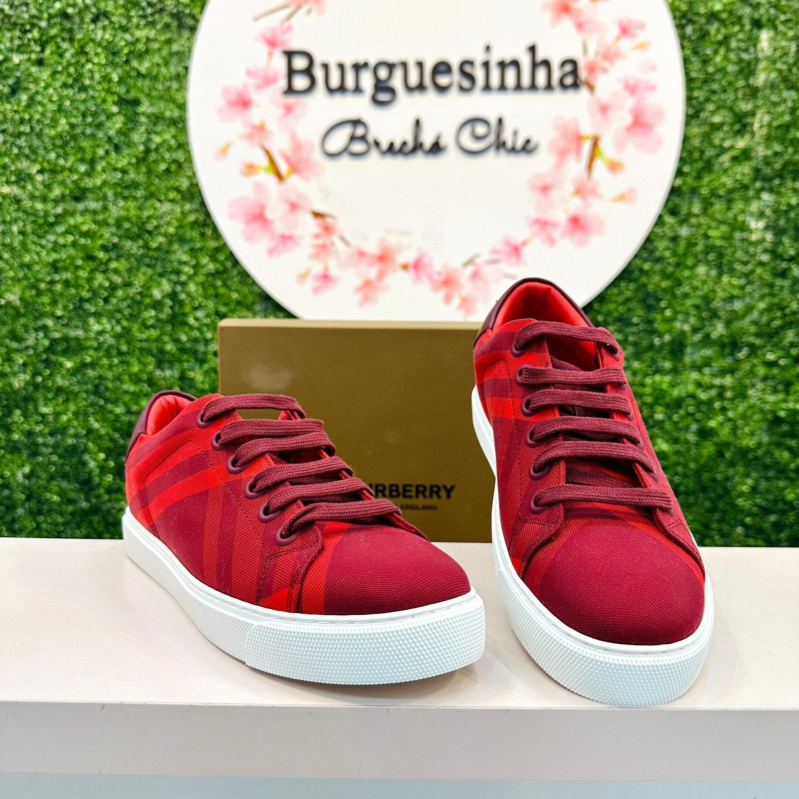 O Tênis Burberry Low Top traz a essência da marca com o tradicional padrão Check em uma vibrante lona canvas vermelha/bordô. Este modelo é perfeito para adicionar um toque de estilo clássico e esportivo ao seu visual. O tênis se encontra em excelente estado de conservação (Seminovo).